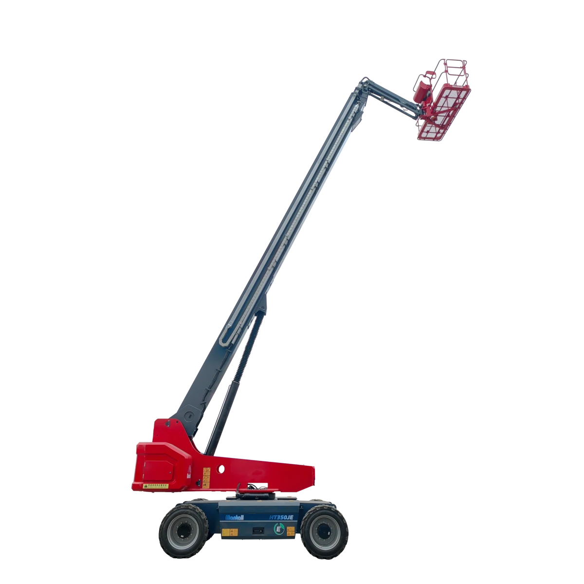 Mantall® HT350JE telescopic boom lift has a working height of up to 35m with a jib, a maximum lifting capacity of 300kg, and is equipped with a large platform that can accommodate up to three workers and tools. 360-degree turntable rotation provides excellent flexibility for difficult work site applications. HT350JE telescopic boom lift has a change mode of travel speed, which can adapt to various rough terrains.